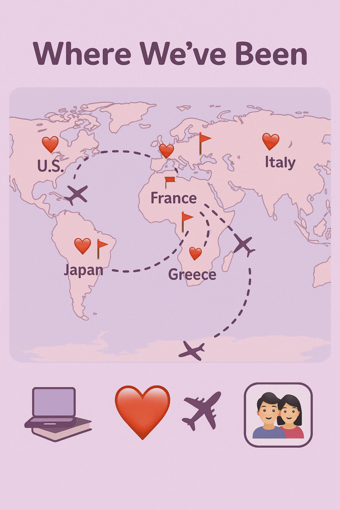 Add stickers of planes, luggage, and mini photo icons to spotlight your favorite stops. It’s perfect for sharing milestones like anniversaries, engagement travels, or just reflecting on how far you’ve journeyed together—literally and emotionally.