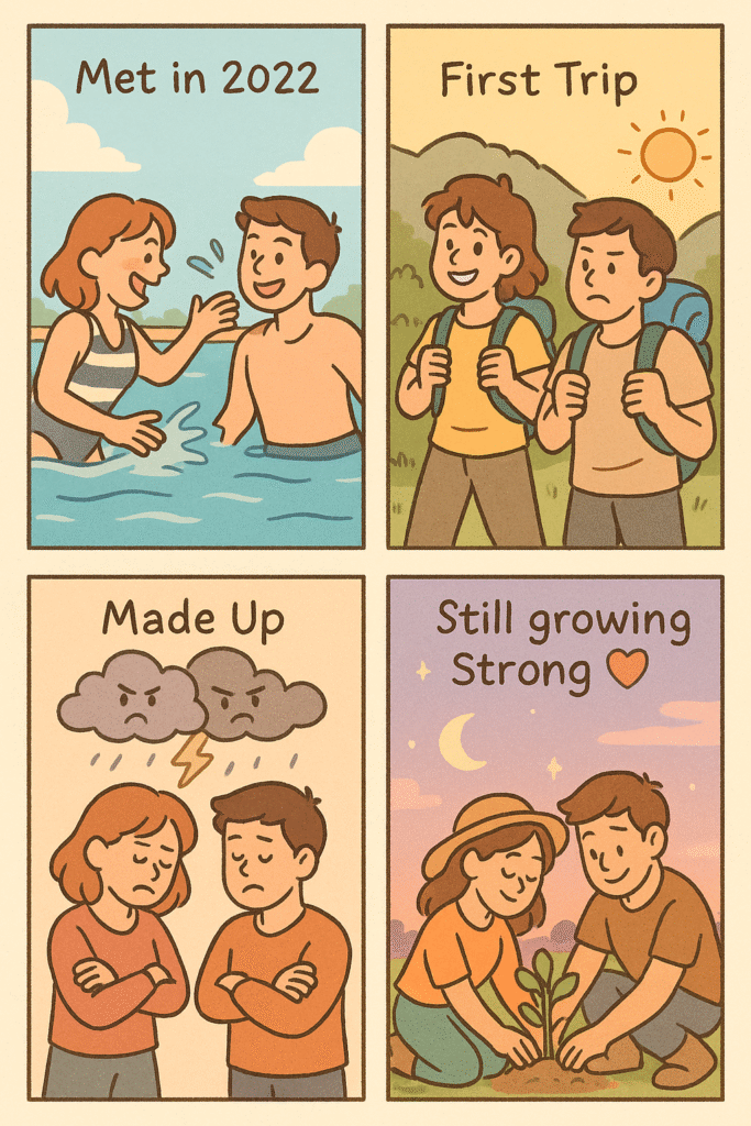 This story format turns your relationship timeline into a visual narrative, just like a little love storybook. By illustrating moments like “Met in 2022 → First Trip → First Fight → Made Up → Still Growing Strong ❤️”, you’re not just sharing photos—you’re telling a relatable, emotional, and heartfelt journey.